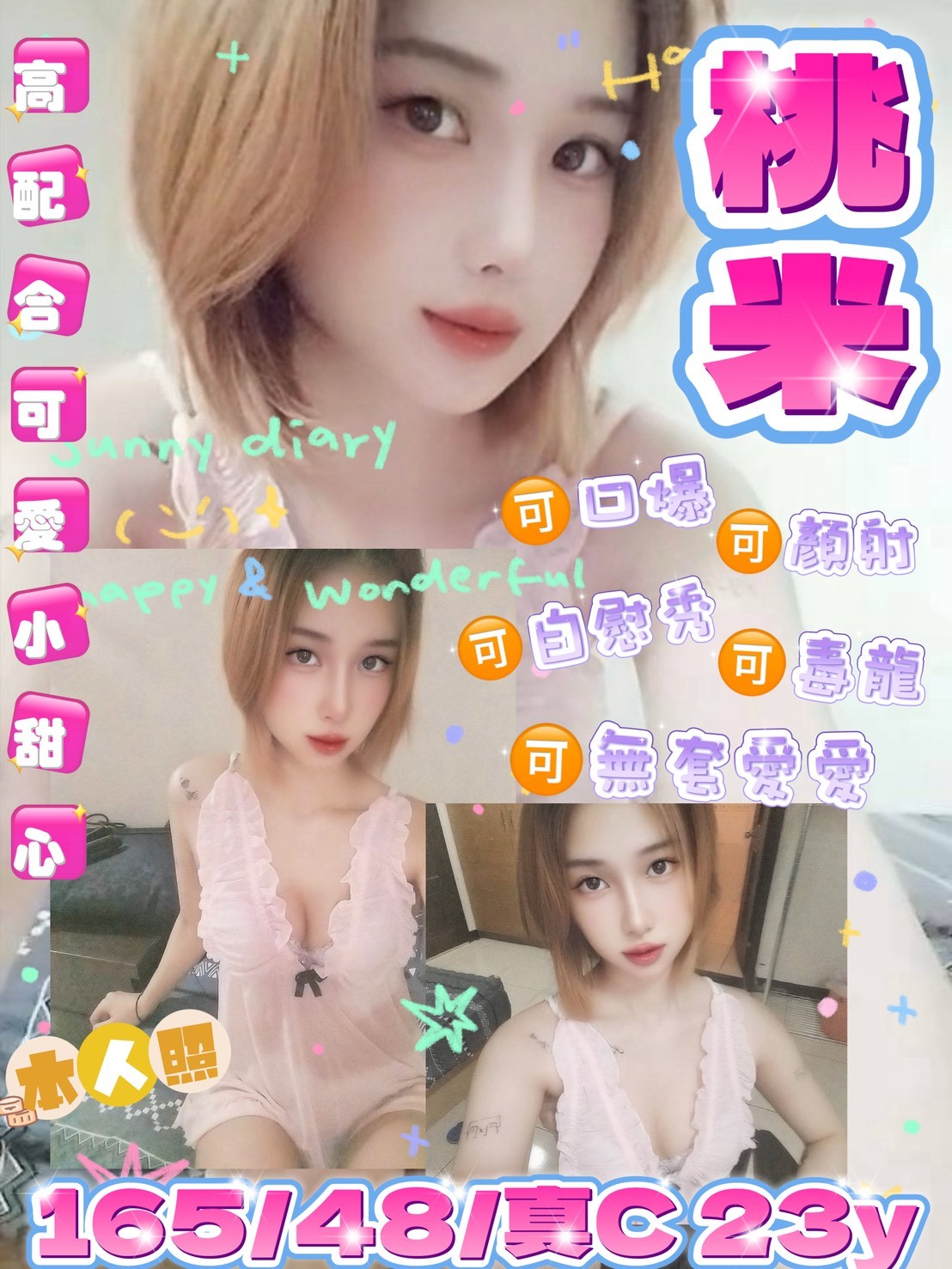 無套吹/親嘴舌吻/品鮑/69/奶炮/胸推/屁推/按摩/舔蛋蛋/懶人澡/水中蕭/淫蕩自慰秀/絲襪/角色扮演/情趣用品(需自備)/口爆+500/顏射+500/入珠+500/🉑2小送1/30/🉑3+1